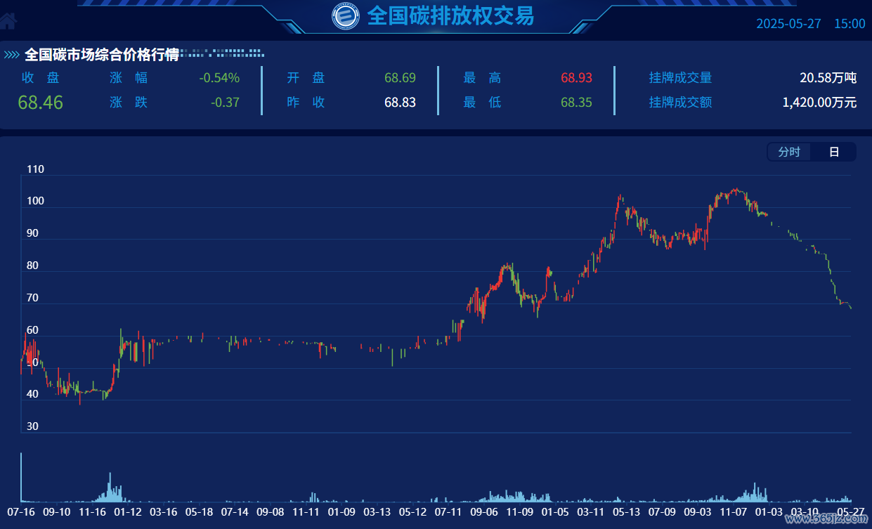 近期,全国碳排放权交易市场(以下简称全国碳市场)CEA(碳配额)价格持续走低,引发市场关注。上海环境能源交易所披露,截至5月27日收盘在线配资,CEA价格为68.46元/吨,较上一交易日下跌0.54%,成交量为20.58万吨,成交额为1420万元。