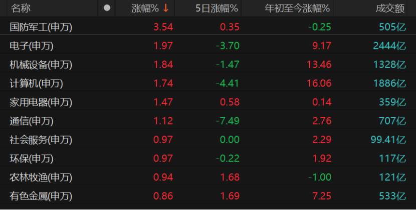 板块分化明显,总体以科技股反弹为主。31个申万一级行业板块中,22个飘红,国防军工板块以3.54%涨幅领先全场,电子、机械设备、计算机板块均涨约2%。而电力设备、煤炭板块跌逾1%。