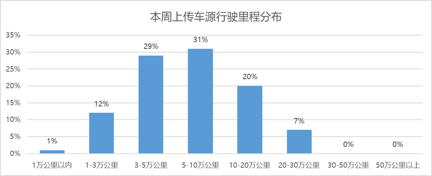 从上传车源行驶里程数据来看,1-3万公里“准新车”数据与上周持平,3-5万公里的“较新车”数据较上周减少了1%,5-10万公里的“性价比”车源数据则较上周增加了1%, 10万公里以上“老旧”车源数据与上周持平,本周上报数据质量较上周略差。